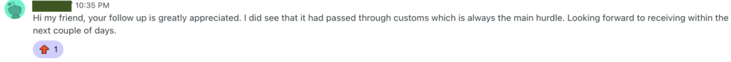 - By dealing, you understand and accept the customs and delivery risks. Once goods leave my hand, I’ve no control or liability for any loss or seizure of goods.